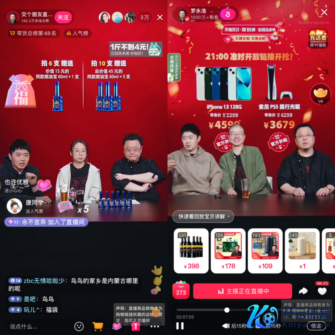 不雅察交个一又友的抖音、淘宝直播间,选品基本接头,皆是白酒、电视、VR一体机等男性需求强的品,有的品在赠品和机制上作念出区别,防护单个平台出现最廉价。同期,交个一又友还邀请了笑果文化的脱口秀演员热场。