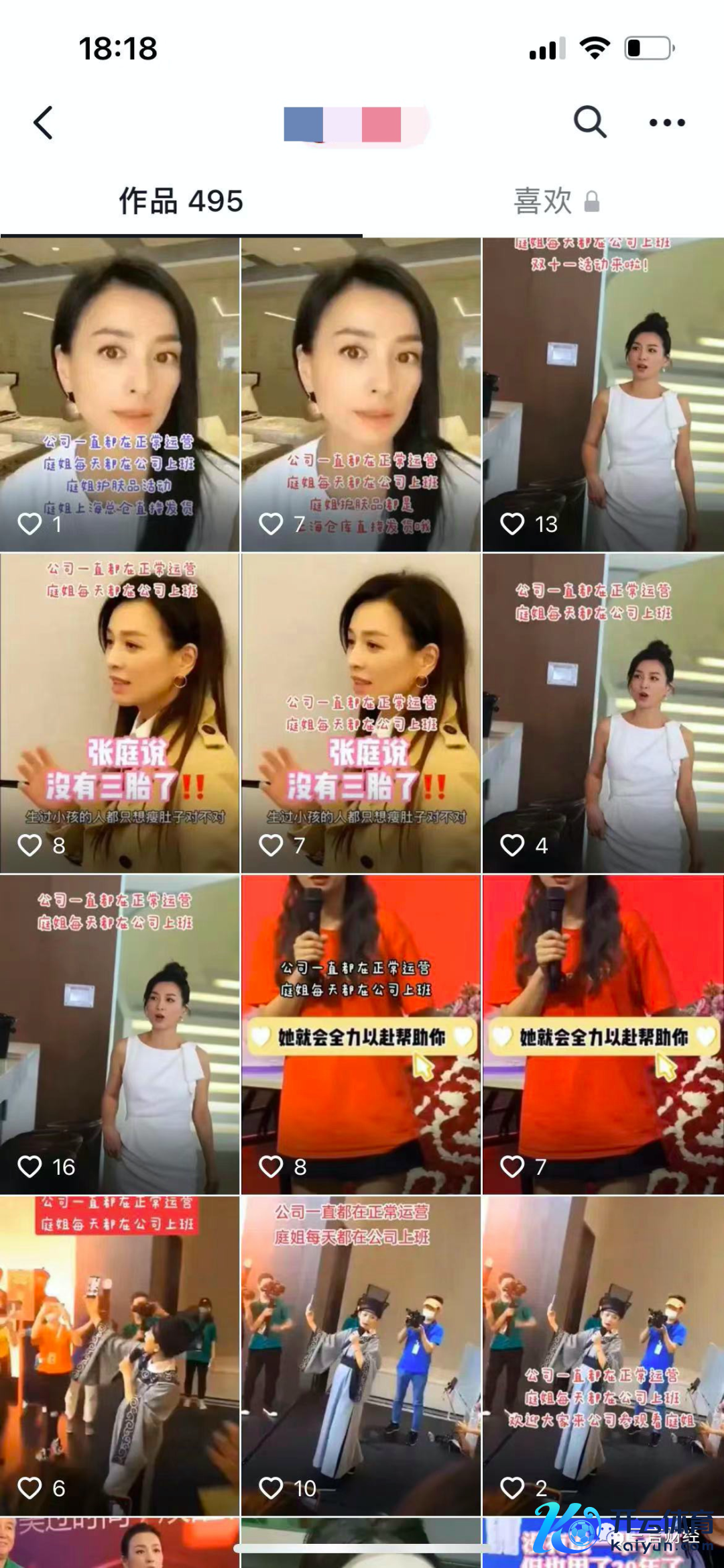 下图中这个账号近期发布了多条视频,并在视频中配文:“公司一直都在普遍运营,庭姐每天都在公司上班”。