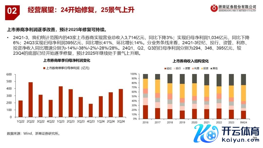 •事迹追念:24Q1-3,咱们统计范围内的43家上市券商已毕营业总收入3,714亿元,同比下落3%;已毕归母净利润1,034亿元,同比下落6%。24Q1、Q2、Q3的归母净利润分辨为294、346、395亿元,较23Q4的底部还是启动逐季建立。