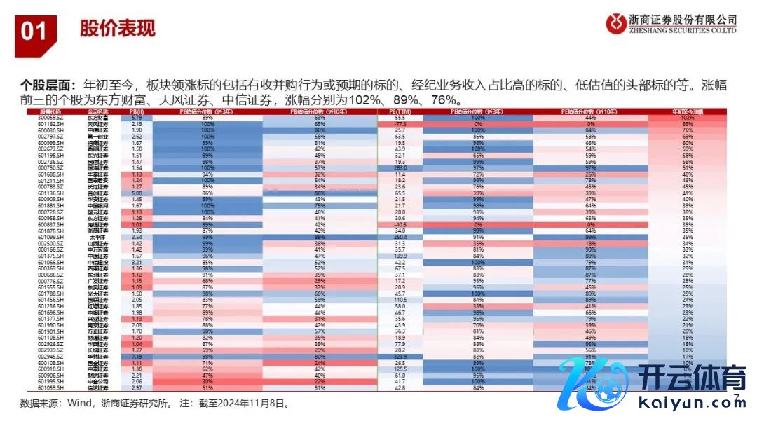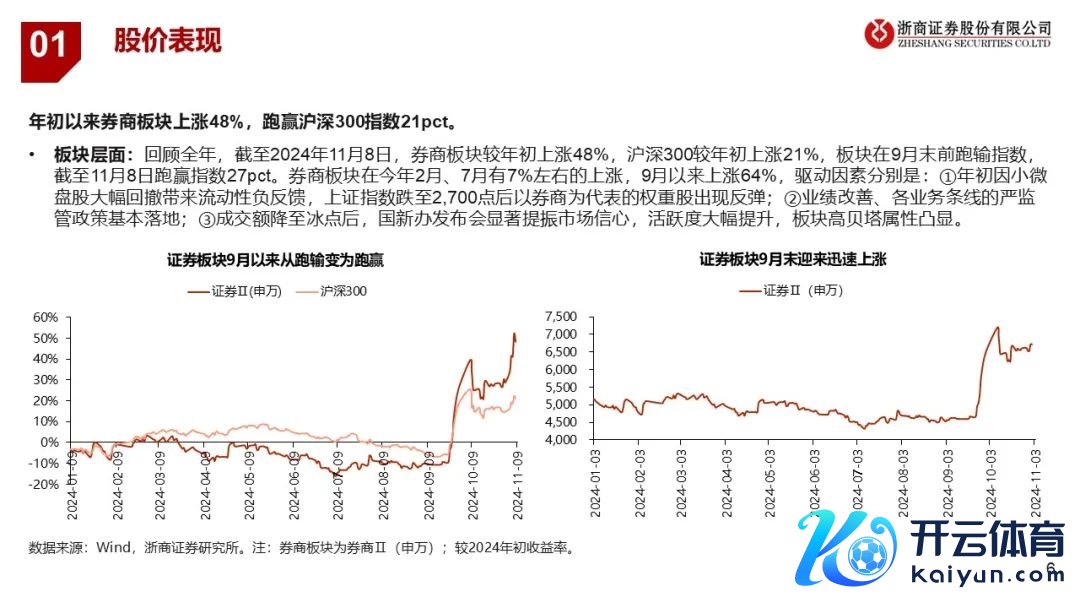•股价发扬:规定2024年11月8日,券商板块较年头高涨48%,沪深300较年头高涨21%,板块在9月末前跑输指数,规定11月8日跑赢指数27pct。券商板块在本年2月、7月有7%阁下的高涨,9月以来高涨64%,驱开拔分分辨是:(1)年头因小微盘股大幅回撤带来流动性负响应,上证指数跌至2,700点后以券商为代表的权重股出现反弹;(2)事迹改善、各业务条线的严监管战略基本落地;(3)成交额降至冰点后,国新办发布会显赫提振商场信心,活跃度大幅普及,板块高贝塔属性突显。