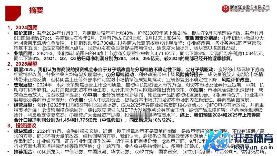 •板块不雅点:2024年11月,金融时报发文称,近期一揽子增量战略不是浮浅的刺激,是战略逻辑的要紧调遣,不仅有短期扩需求的决策,同期还有多数的立异、结构调遣的决策。咱们以为,后续仍会有增量战略徐徐落地,提振商场信心,券商板块迎多厚利好:(1)事迹方面,证券行业利润逐季改善,来岁基本面有望延续;(2)战略方面,9月以来提振本钱商场的战略频出,行业方面也有风控主义优化等战略落地;(3)主题方面,业内收并购握续推动。多项利好重复,赓续看好板块后续发扬。