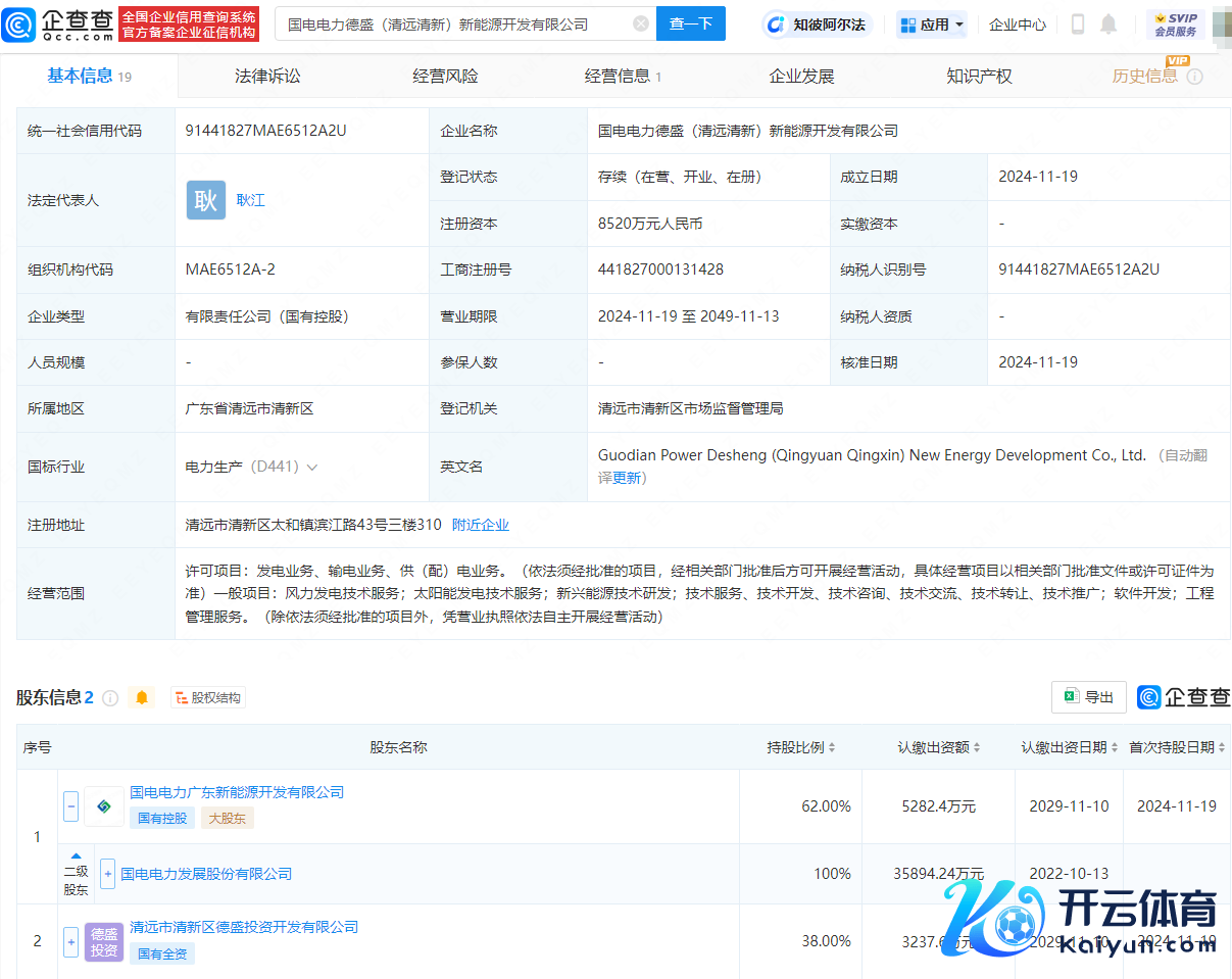 企查查APP长远,近日,国电电力德盛(清远极新)新动力拓荒有限公司修复,法定代表东说念主为耿江,注册本钱为8520万元东说念主民币,经营领域包含:发电业务、输电业务、供(配)电业务;风力发电本领做事;太阳能发电本领做事;新兴动力本领研发等。企查查股权穿透长远,该公司由国电电力(600795)旗下国电电力广东新动力拓荒有限公司,及清远市极新区德盛投资拓荒有限公司共同握股。