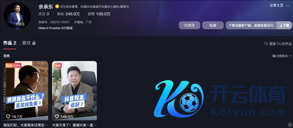 华为常务董事余承东近日在短视频平台抖音上怒放了个东说念主账号,并发布了两条动态视频。他的最新一条动态通知开云体育,鸿蒙智行年度直播将于12月19日中午12点举行。