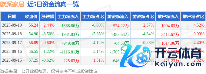 证券之星音讯,欺压2025年9月19日收盘,欧派家居(603833)报收于56.24元,高潮2.44%,换手率0.71%,成交量4.34万手,成交额2.42亿元。
