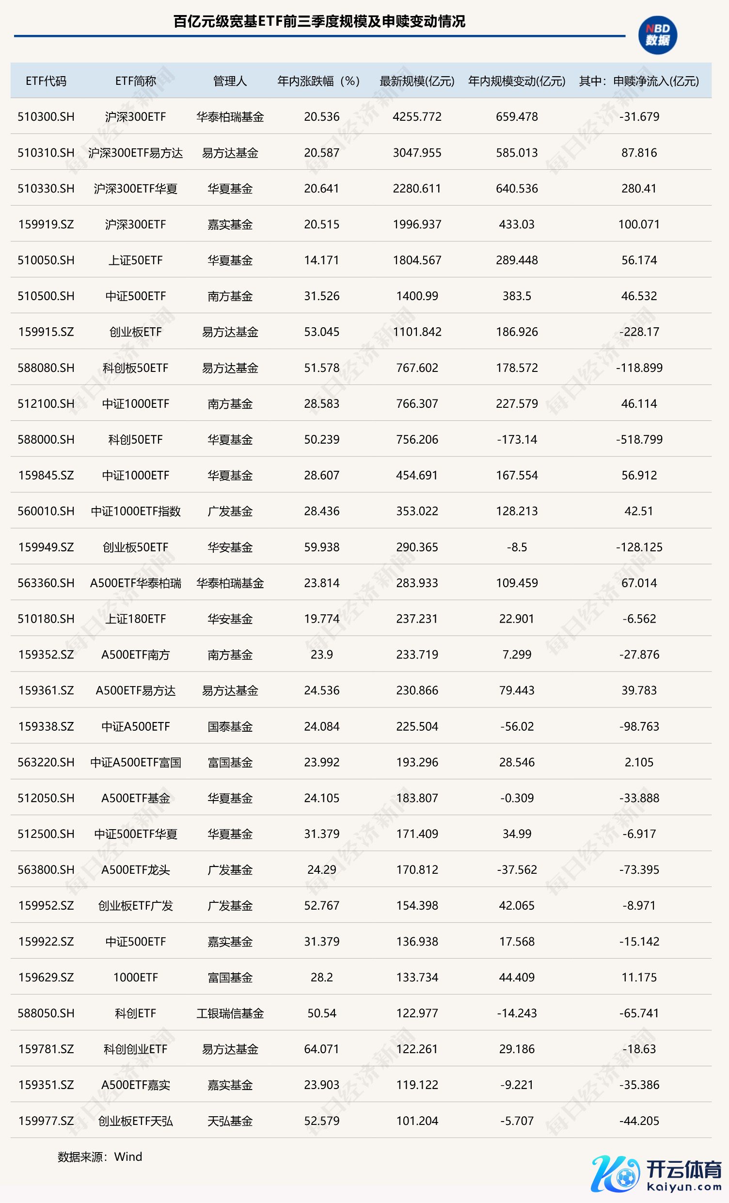 Wind数据走漏,限度9月30日,全阛阓共有29只宽基ETF范围朝上100亿元。其中,华泰柏瑞旗下沪深300ETF范围达到4255.77亿元稳居第一,易方达、中原和嘉实基金旗下沪深300ETF排在第二到第四,范围辨认为3047.96亿元、2280.61亿元和1996.94亿元。功绩方面,这4只“巨无霸”ETF前三季度均涨超20%,相对沪深300指数有小幅逾额,举座推崇慎重。
