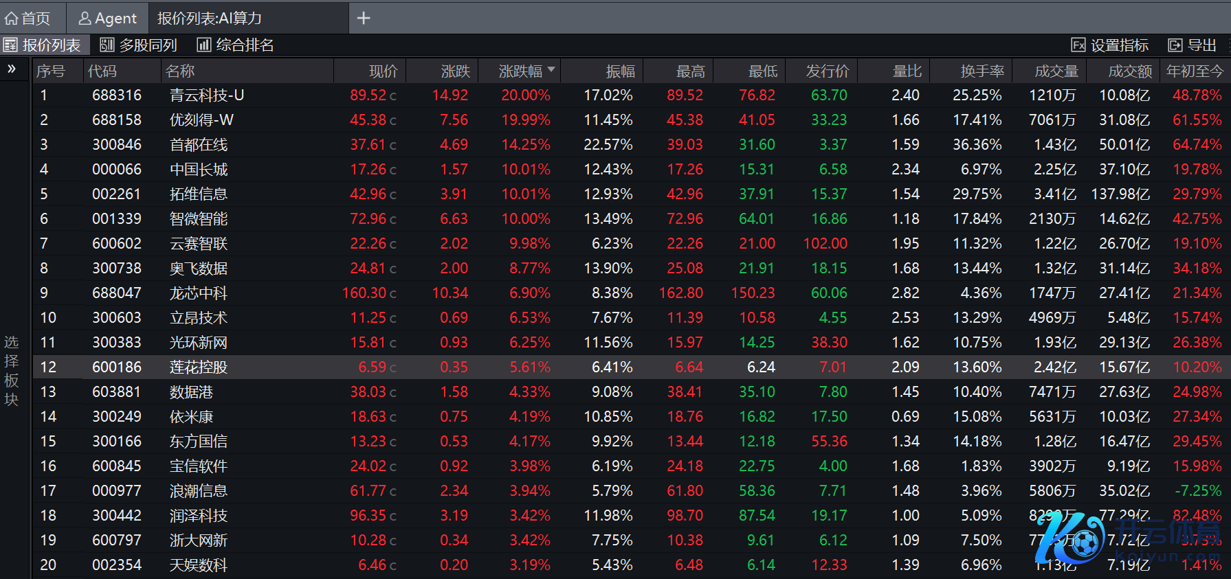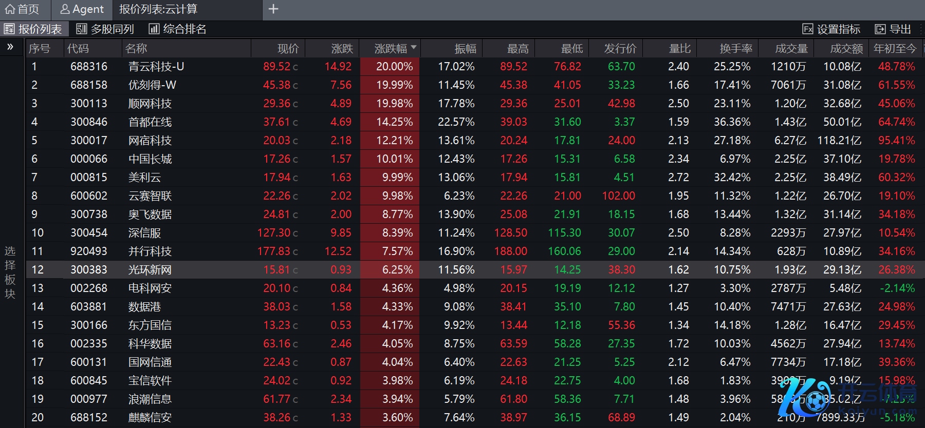 狂放收盘,青云科技(688316.SH)、优刻得(688158.SH)、顺网科技(300113.SZ)“20cm”涨停,中国长城(000066.SZ)、好意思利云(000815.SZ)、云赛智联(600602.SH)、拓维信息(002261.SZ)、智微智能(001339.SZ)“10cm”涨停,两个板块涨停个股达到8只。此外,都门在线(300846.SZ)、网宿科技(300017.SZ)涨超10%。